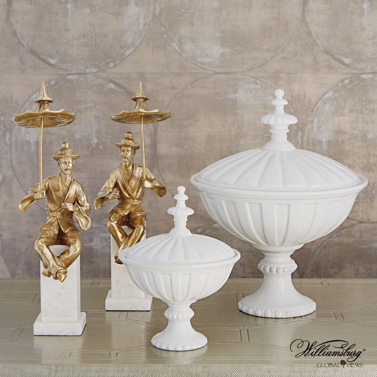 新古典主義建築在十八世紀大行其道,美國第三任總統湯瑪斯•傑弗遜深受經典傳統美學影響,非常欣賞義大利著名建築師安德列•帕拉迪奧的作品,這也是傑弗遜總統為人熟知的事蹟,在當時的美國,這位總統曾親手設計過帕拉迪奧式風格的建築,在蒙蒂塞洛尤其常見。Global Views 的 Williamsburg 系列新推出這組新古典主義陶瓷翁,莊嚴而優雅,充分展示出帕拉迪奧式的經典風格,是對“潮流與傳統巧妙相遇”的完美詮釋,不論是古典抑或當代室內空間,都能搭配出輕鬆隨意的高雅氛圍。