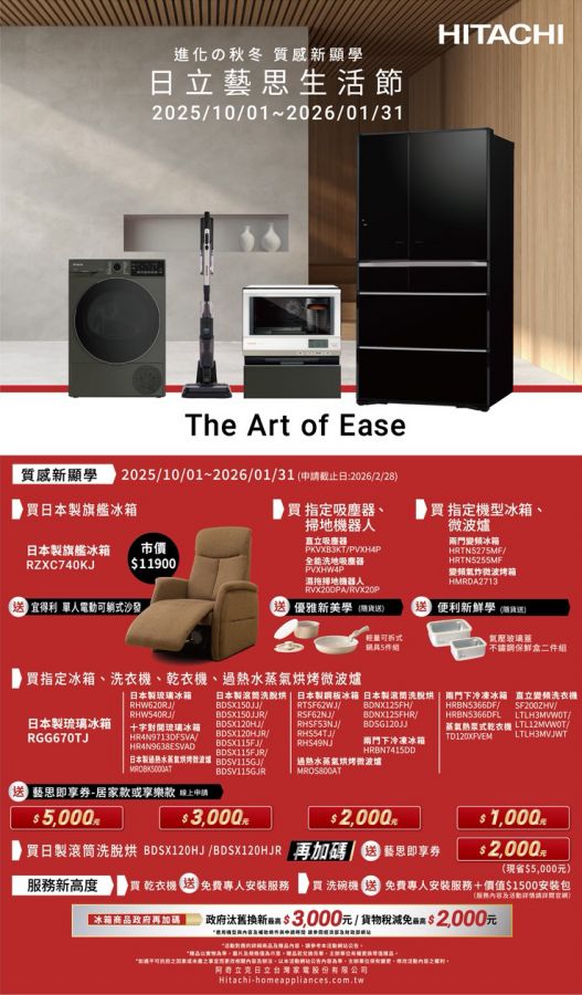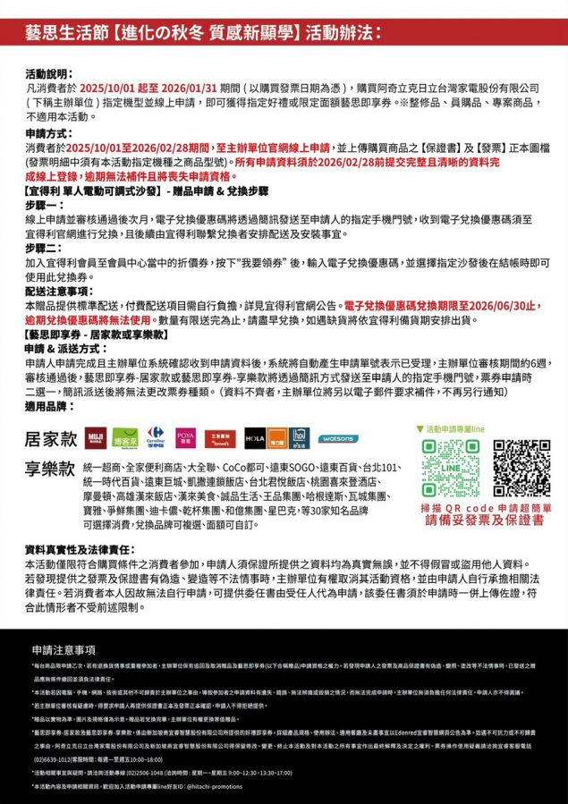 凡於2025/10/01起至2026/01/31 期間,購買日立家電指定機型,即可獲得宜得利單人電動可躺式沙發、限定面額藝思即享券-居家款或享樂款。