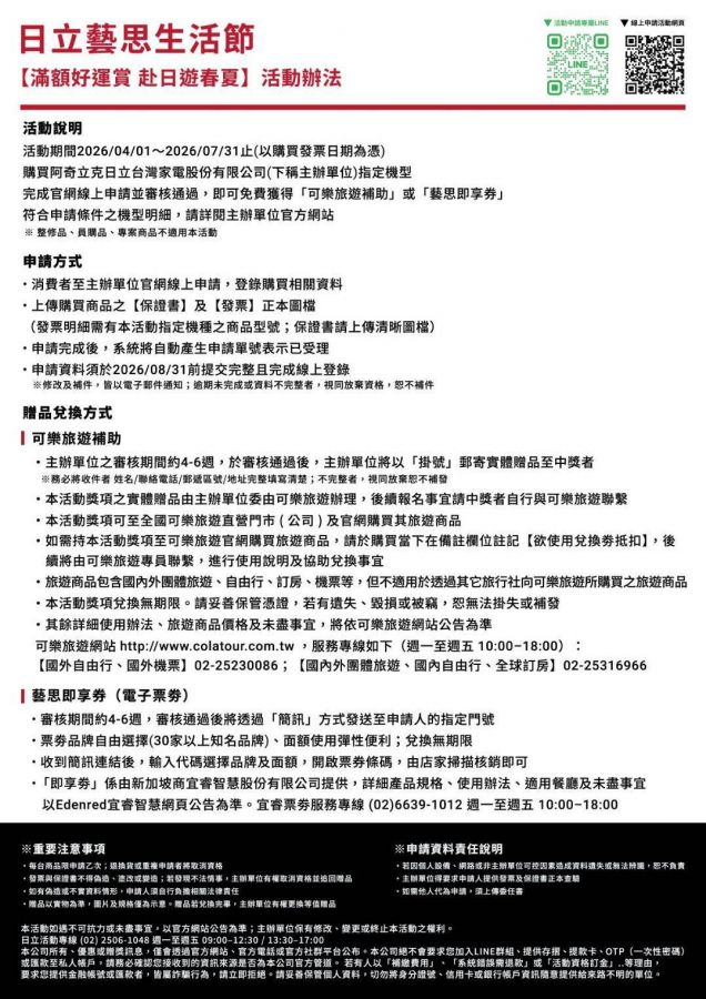 活動期間2026/04/01~2026/07/31止(以購買發買發募發期為憑)購員阿奇立克日立台灣家電股份有限公司指定機型完成官網線上申請並審核通過,即可免費獲得「可樂旅遊補助」或「藝思即享券」。