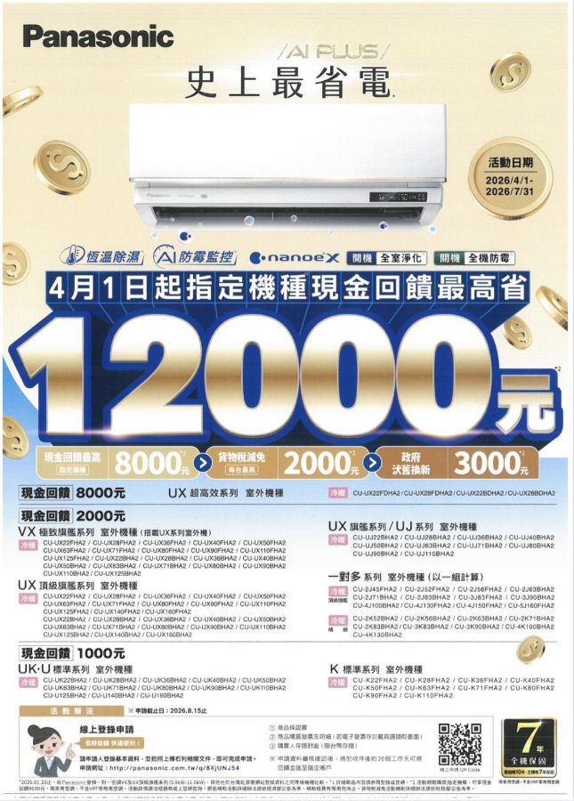 4月1日起購買家用空調指定機種,現金回饋最高省12000元!
