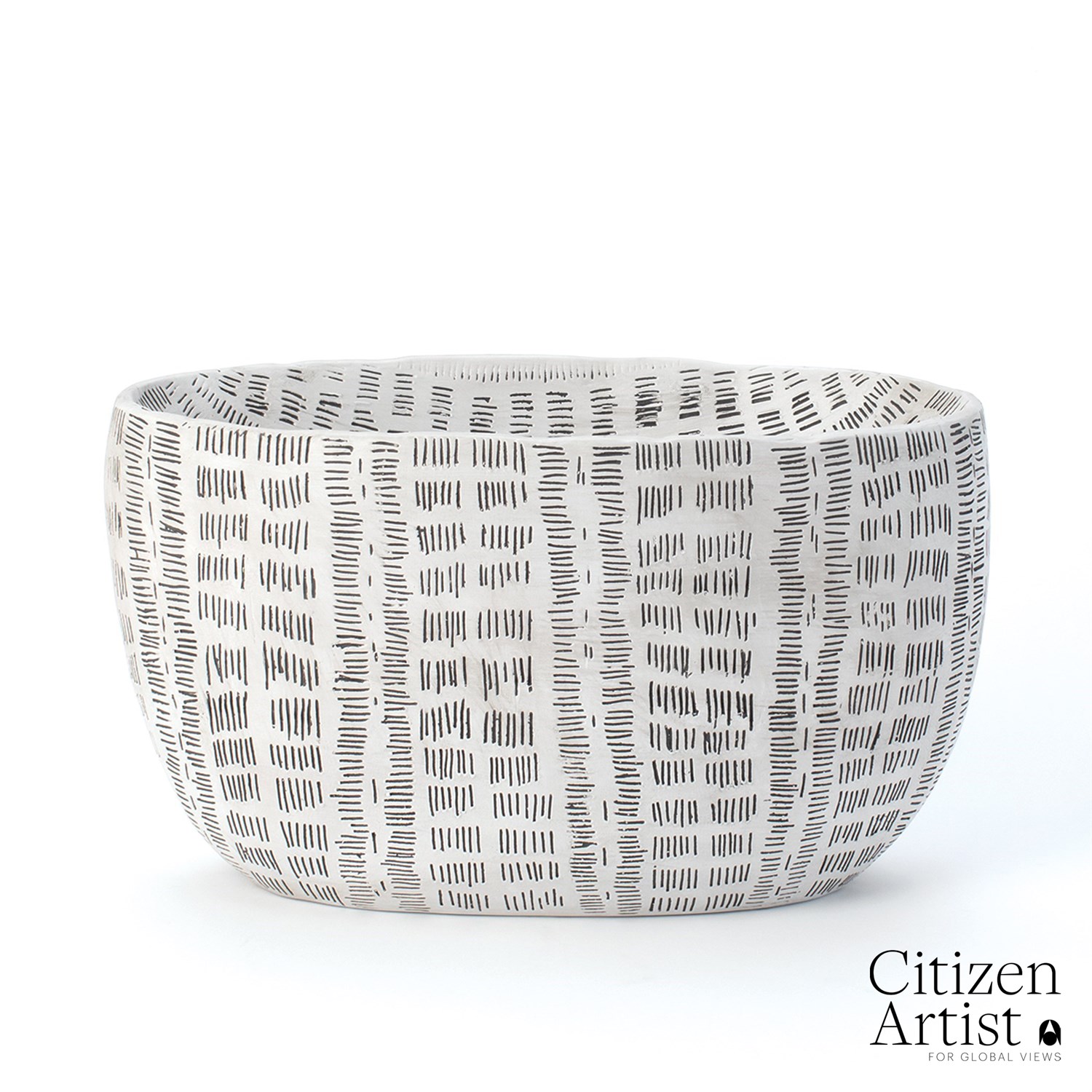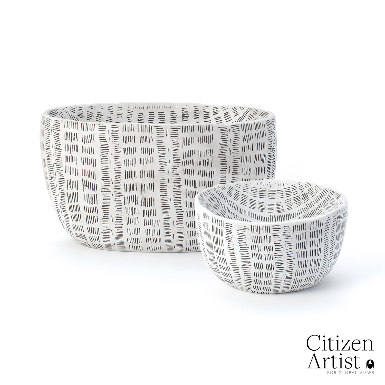 The Frequency Bowls feature an African mud-cloth-inspired original painting by the designers that is carved into the ceramic forms, then glazed and washed to create the contrast between the patt