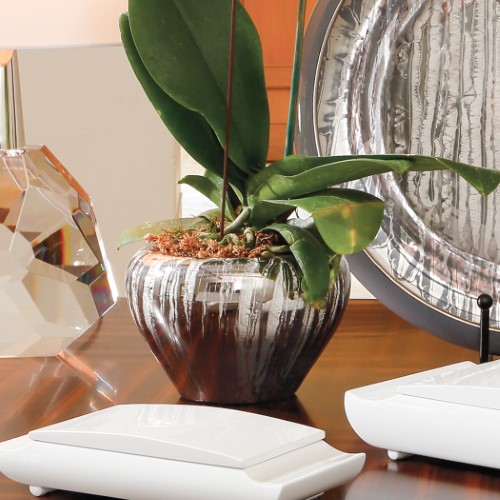 第一眼看上去給人玻璃的錯覺,實則為真正的義大利陶瓷。水銀活性釉面在充滿光澤的平面上傾瀉而下,猶如天地間的一幕雨簾。 Glass-like in appearance, our Metallic Platinum Cachepot is actually Italian ceramic. The mercurial silver reactive glaze gives the impression of falling rain on a lustrous surface.