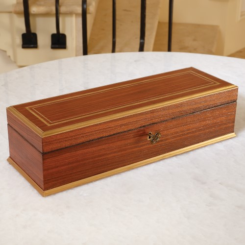 Good for storing your gloves or your cherished treasures, our Glove Box is a pretty little piece to display anywhere. The brass details absolutely glow against the warm teak finish of the wood. The matching brass key is a charming touch.