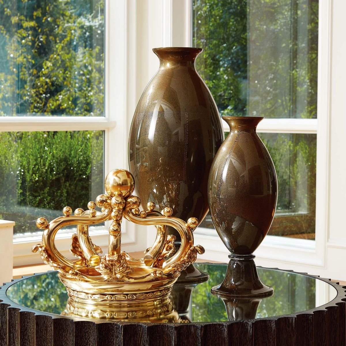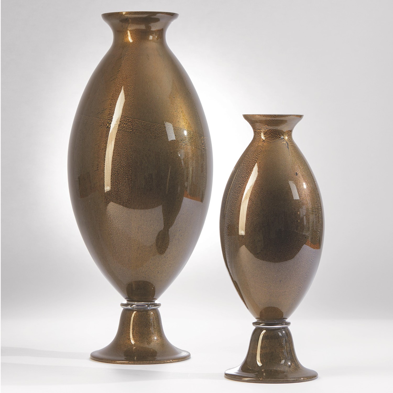 Black art glass gets a radiant finish on our D′Oro Nero Urn. Gold leaf has been applied on top of the rich black glass. The classic and elegant urn shape is updated with the metallic finish giving it a more contemporary feel while maintaining their classic nature.