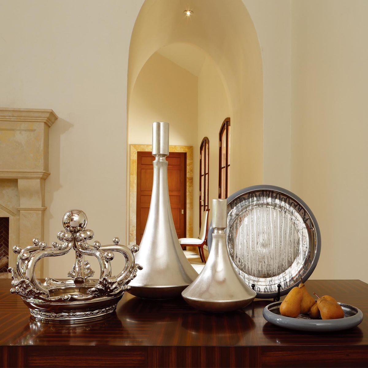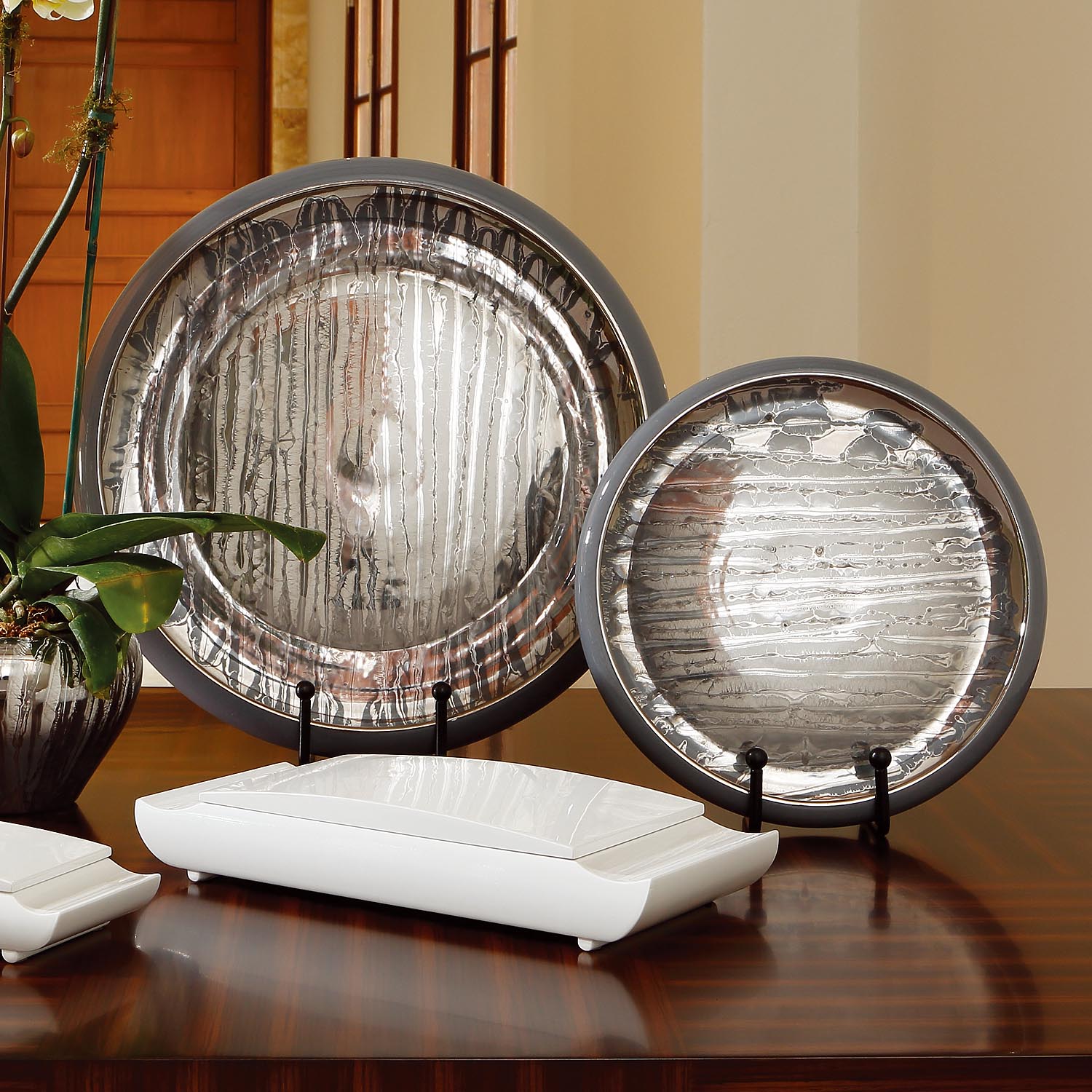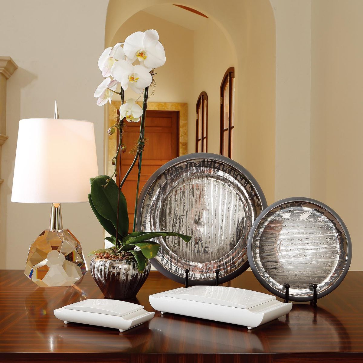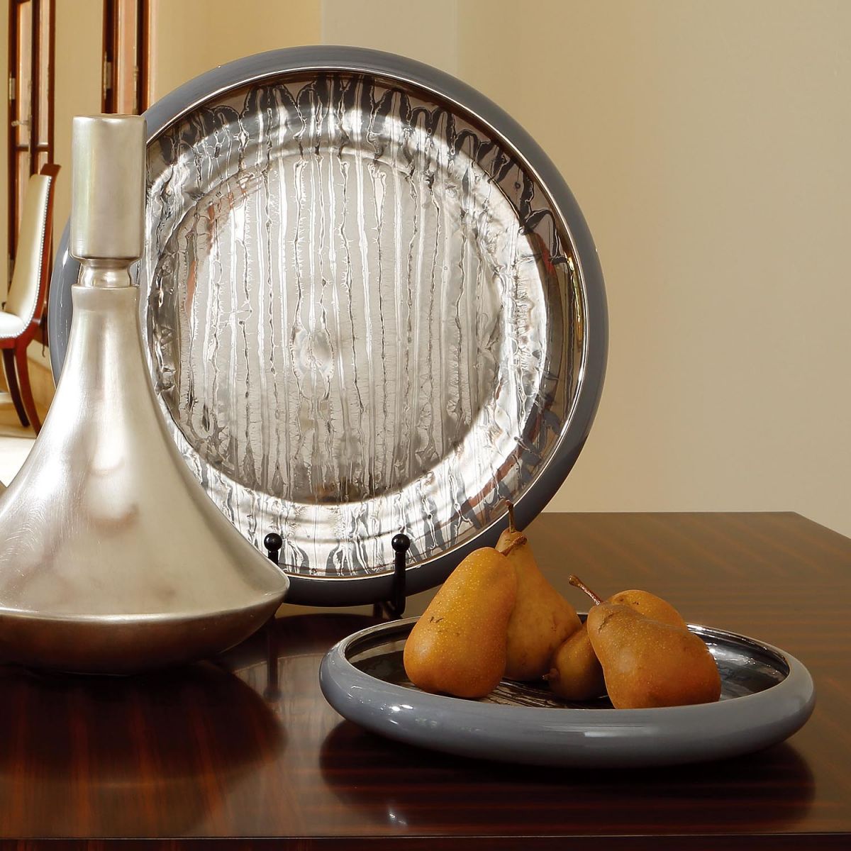 看似玻璃的外表,實則為義大利陶瓷,水銀活性釉面在充滿光澤的平面上傾瀉而下,猶如天地間的一幕雨簾。 Glass-like in appearance, our Metallic Platinum Bowl is actually Italian ceramic. The mercurial silver reactive glaze gives the impression of falling rain on a lustrous surface.