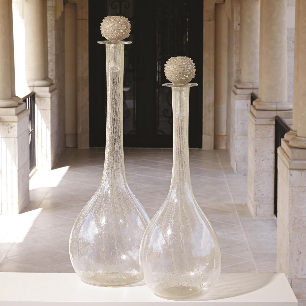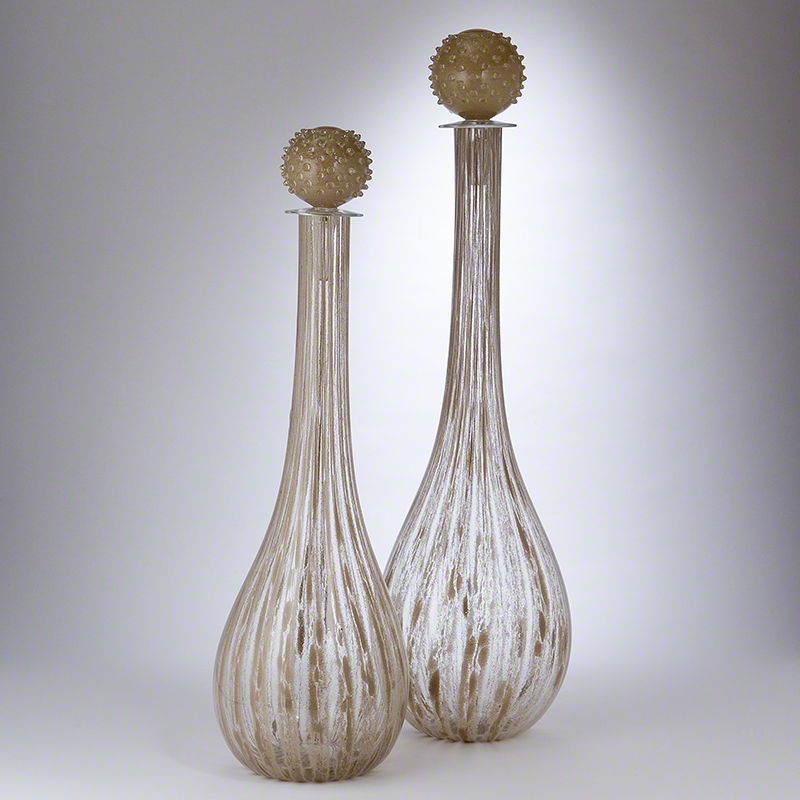 Handmade by artisans in Italy. Inspired by oversized antique perfume bottles with stopper that contains over 100 hand applied glass beads. Silver metal flakes suspended in three layers of glass add sparkle and dimension to the piece. No two are identical.
