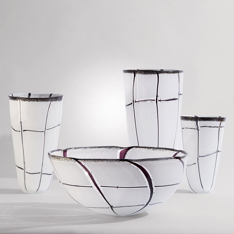Molten strips of black glass are layered over hand blown white art glass for a crisp and bold effect. Graphic and unique, the Abstract Grid Bowls are perfect for adding a touch of mod-chic to your space.