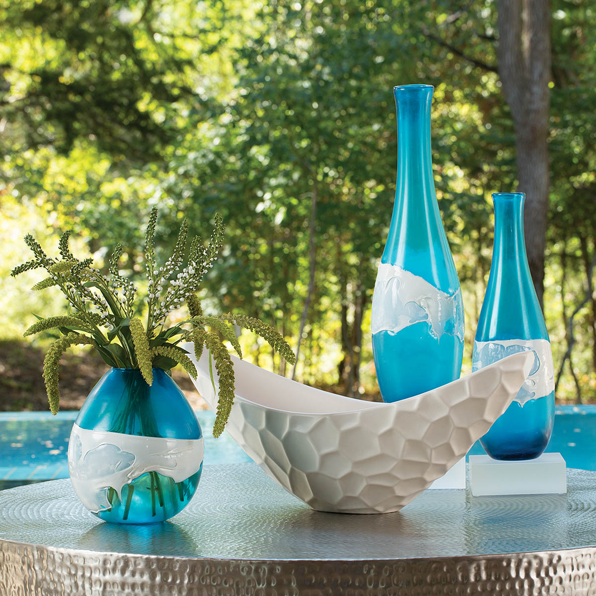 葡萄牙進口,採用中空雙層壁模具得以成型,外層呈現出白色提花蜂窩浮雕紋理,繁複而高雅。 White-on-white honeycomb bas relief on the outside of our double-walled oval bowl, is elegant and sophisticated.