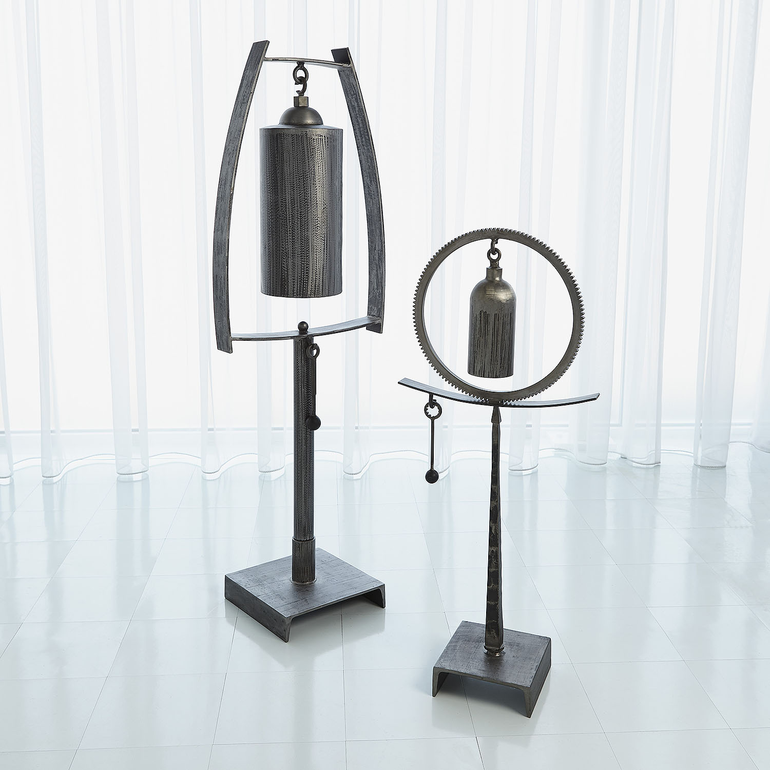 Ernst Gruler′s original Sound Sculptures were made from repurposed scrap steel and pressure canisters, with a liberal sprinkling of industrial chic, and the technical and aesthetic attention to detail that informs all of Ernst′s work. The bells are meant to be rung, and in many cases other parts of the sculptures also resonate when struck. This is why he calls them Sound Sculptures: they invite exploration and interaction, along with the contemplation of the origin and previous functions of the various scrap components of the sculptures. Studio A Home has reproduced Ernst′s original Sound Sculptures from iron. They exactly reflect the component parts of his originals. Available in three styles.
