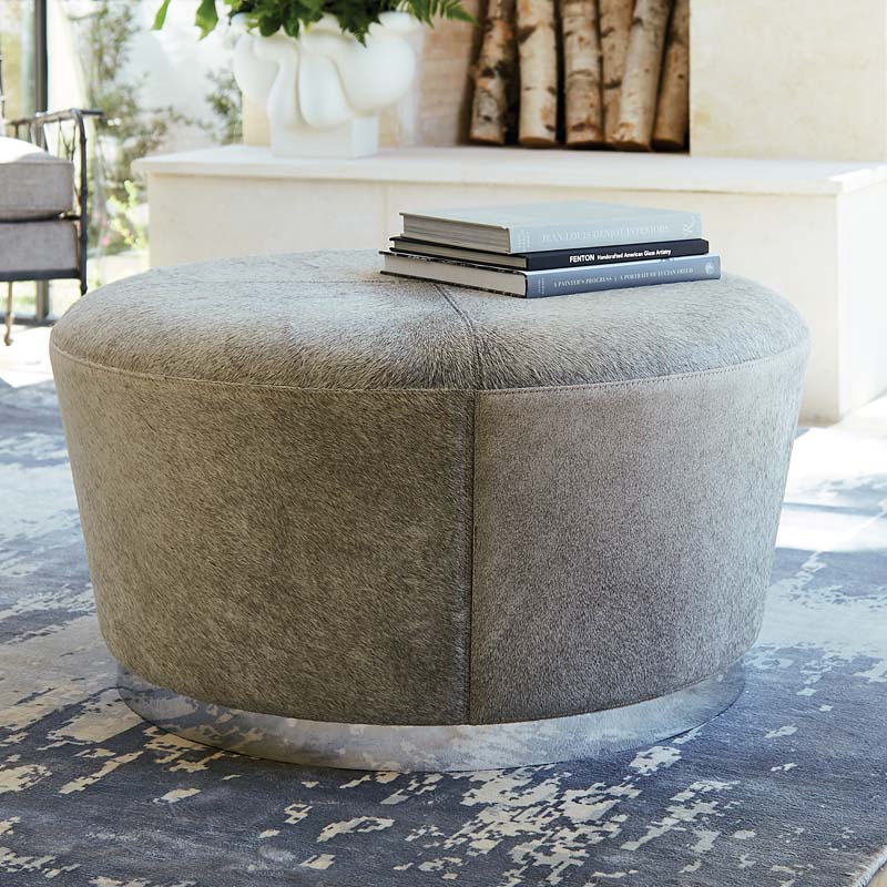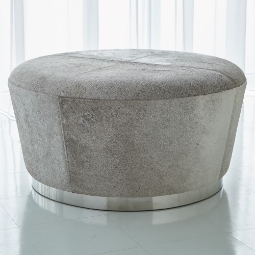 A cocktail table-sized hair-on-hide ottoman is functional as well as beautiful. Use it for seating, as a coffee table with a large tray , or just put your feet up! Grey hair-on-hide; top stitching. Nickel-finished trim.