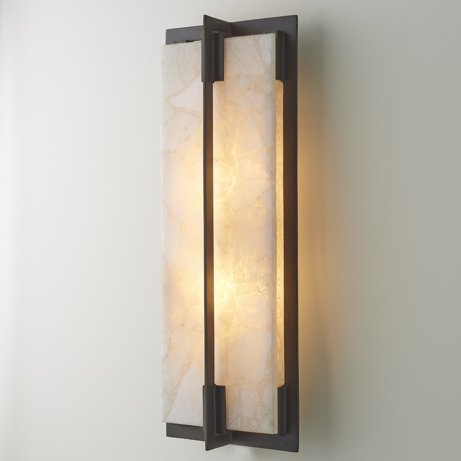 Delicate panels of quartz slide into the multi-faceted iron frame of the Quartz Sconces. The light cast through the translucent stone is unsurpassed in the warm glow it emits. Available in hardwired and portable versions.