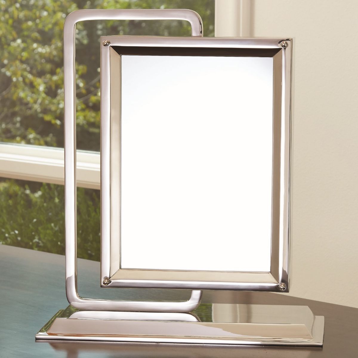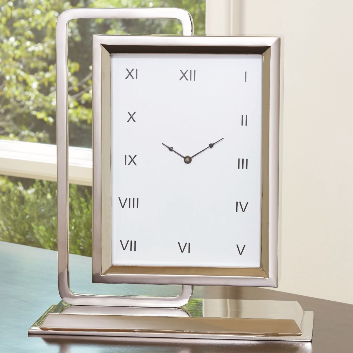 Our "Time to Reflect" is a multi-tasking dynamo. A simple shiny nickel finished frame holds a large rectangular clock that swivels to reveal a mirror on the other side. The slim footprint makes it a fantastic piece for any surface. The mirror pops out easily for convenient access to change the clock battery.