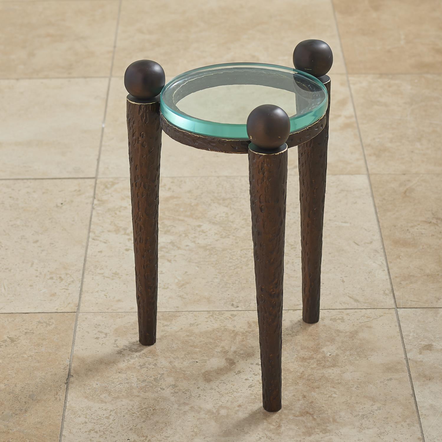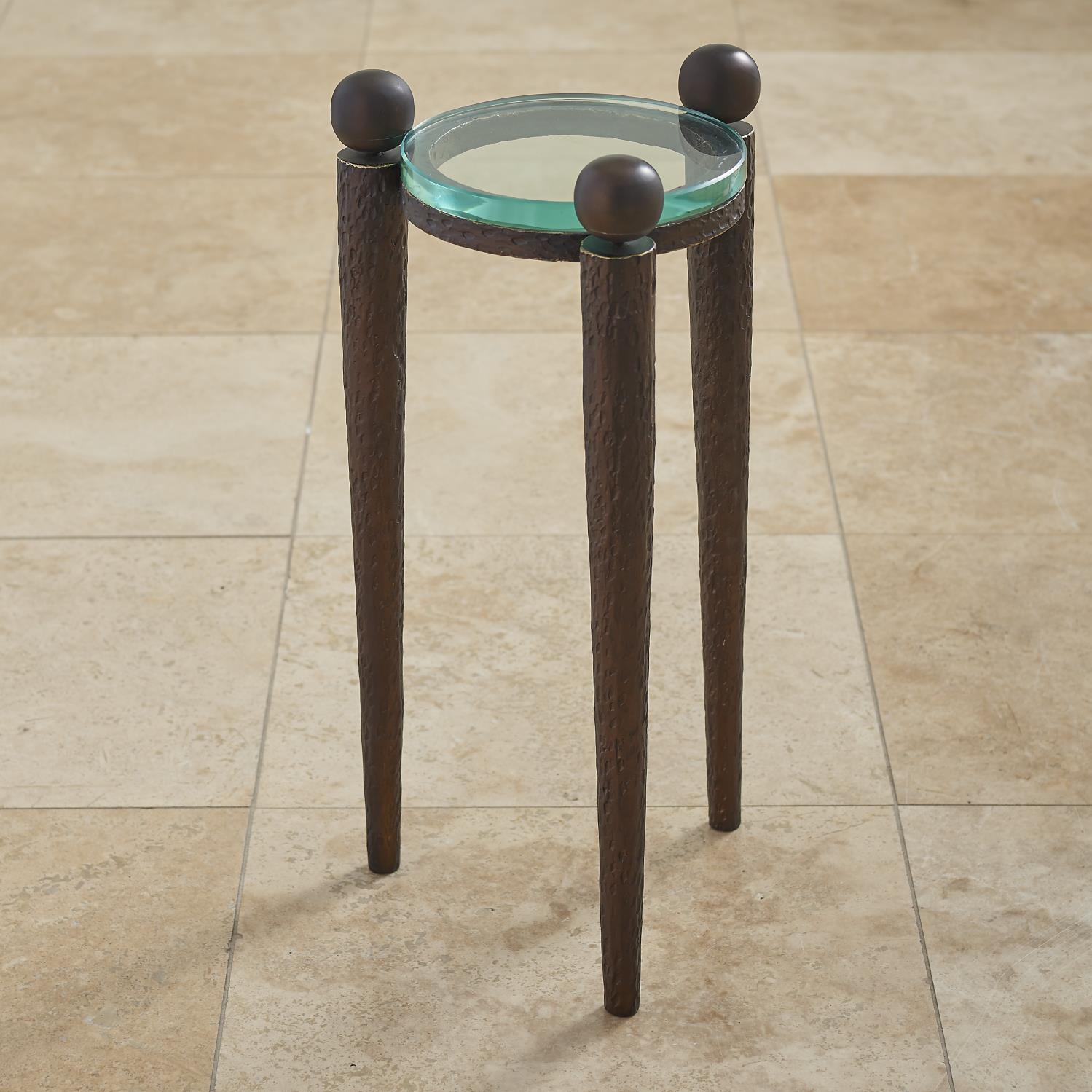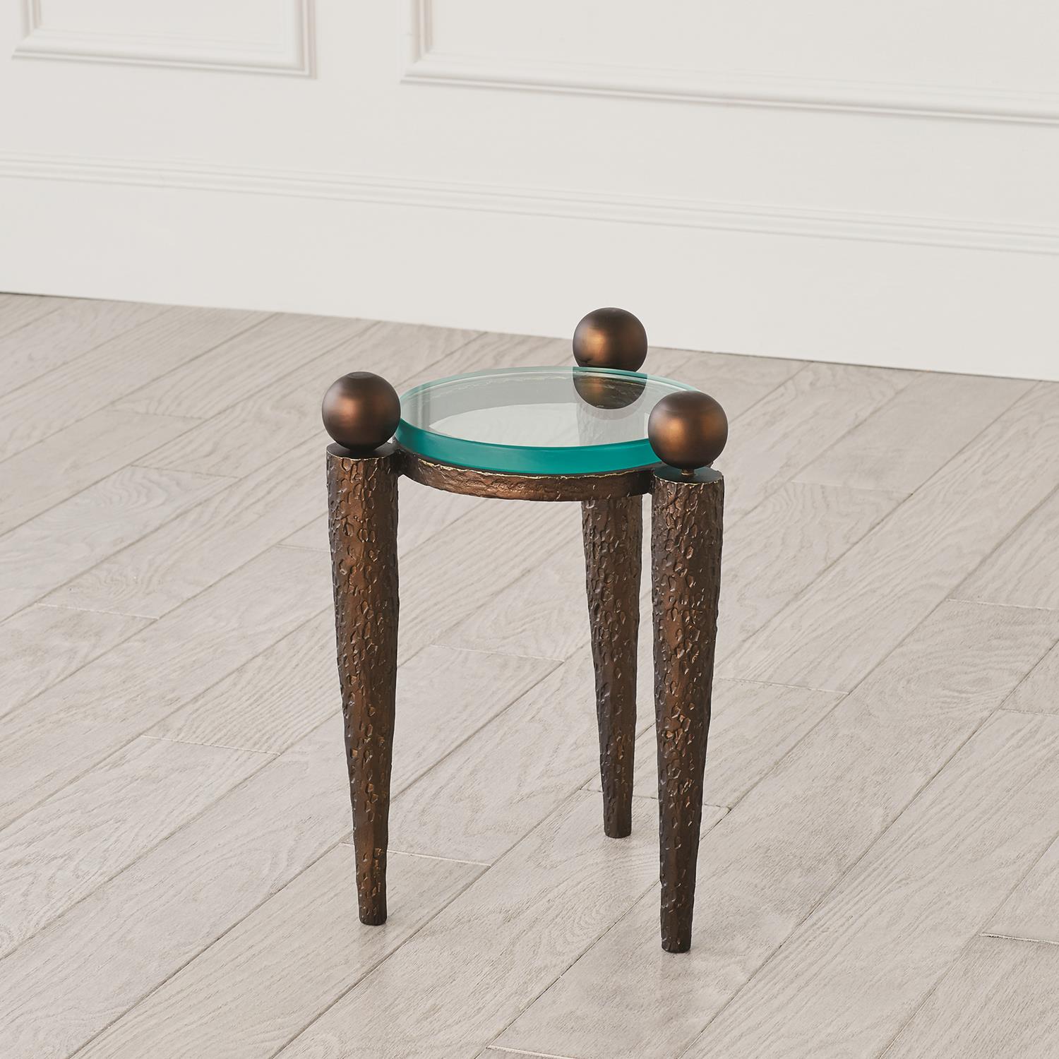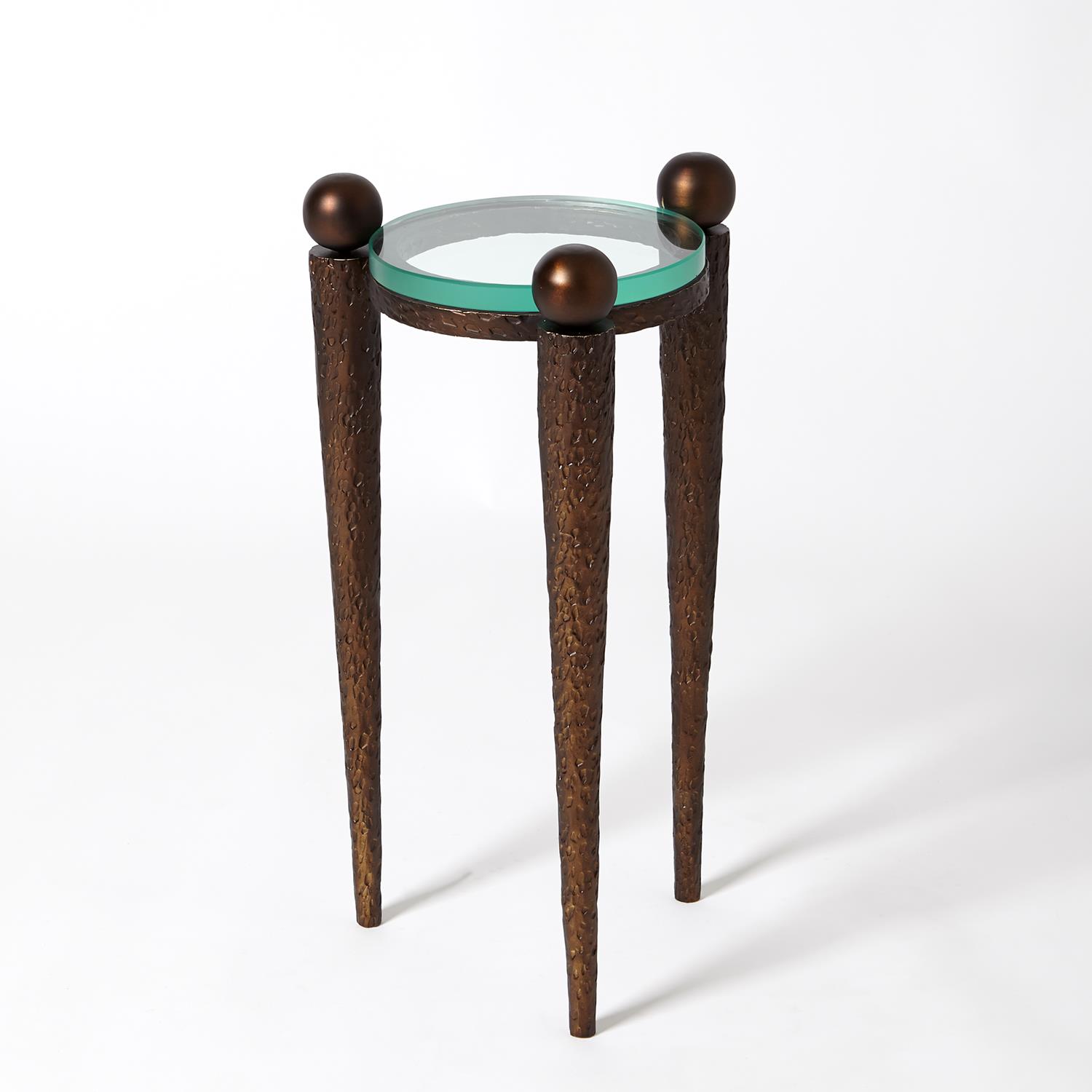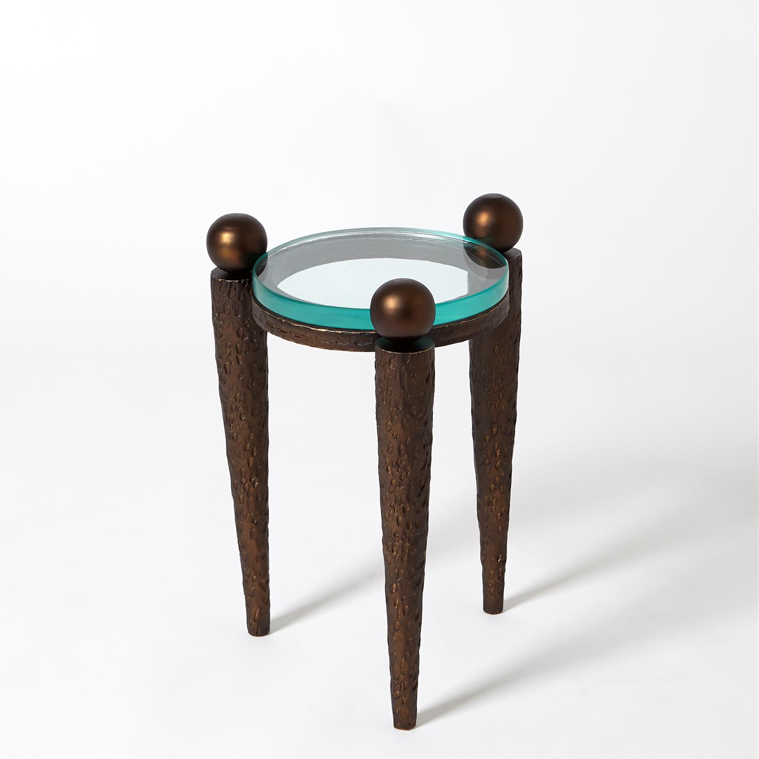 由細漸粗的金屬桌腳與厚實的玻璃桌面相得益彰,桌腳頂部的裝飾球兼具固定桌面的作用。輕鬆愉快的設計,如同空間中跳躍的精靈。 Made of iron with a metal bronze finish, this delightful accent table has three decorative spheres capturing the thick glass top. Available in two sizes.