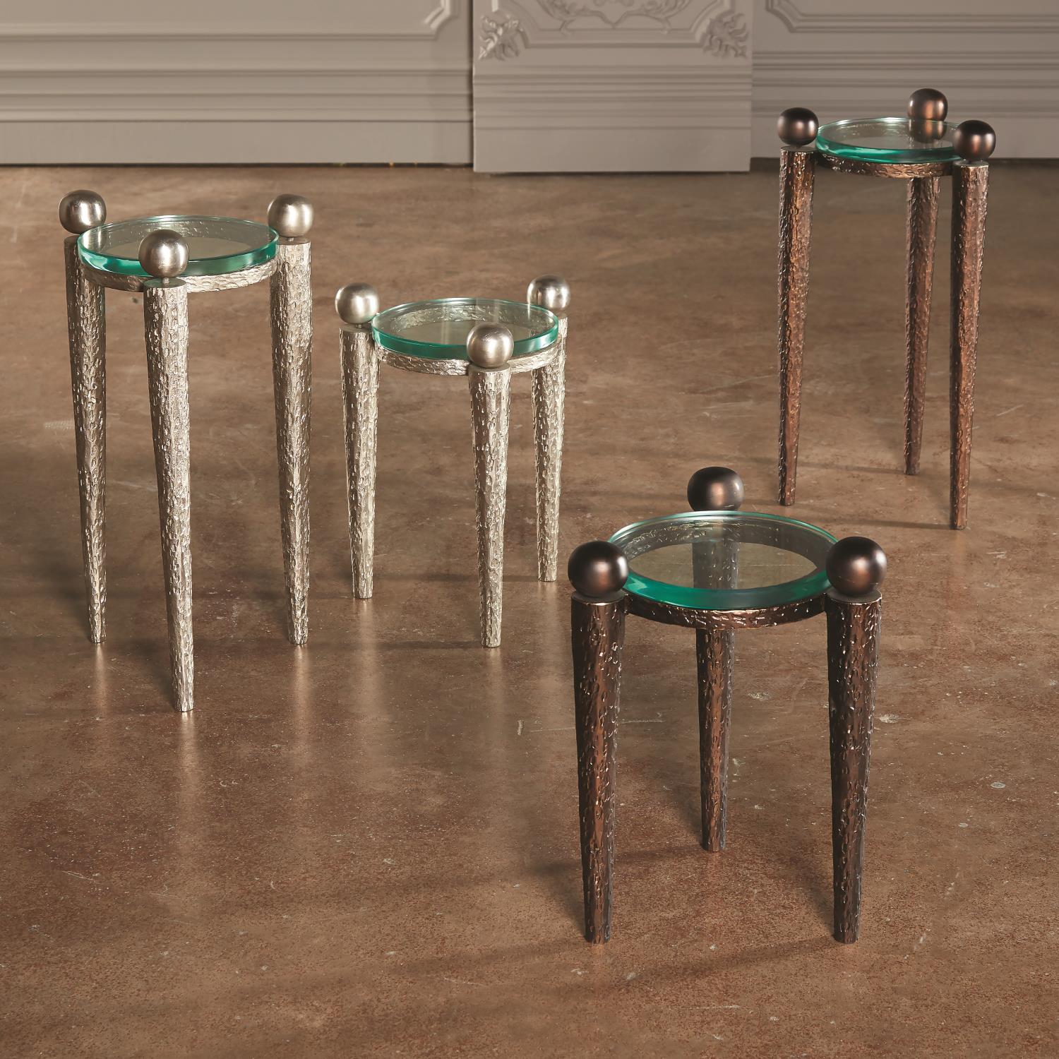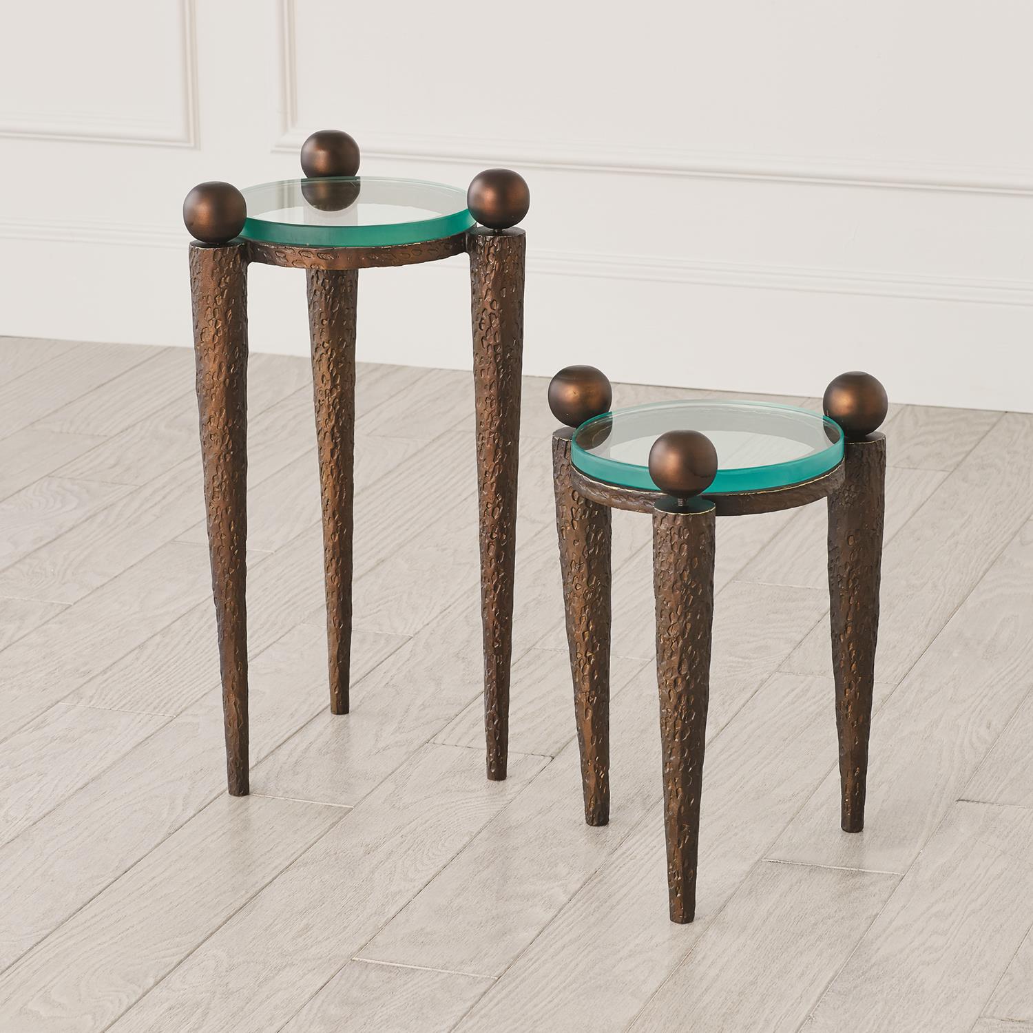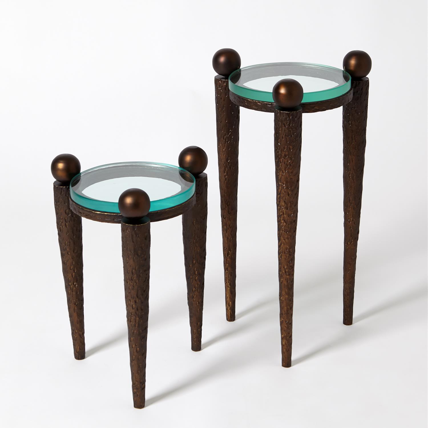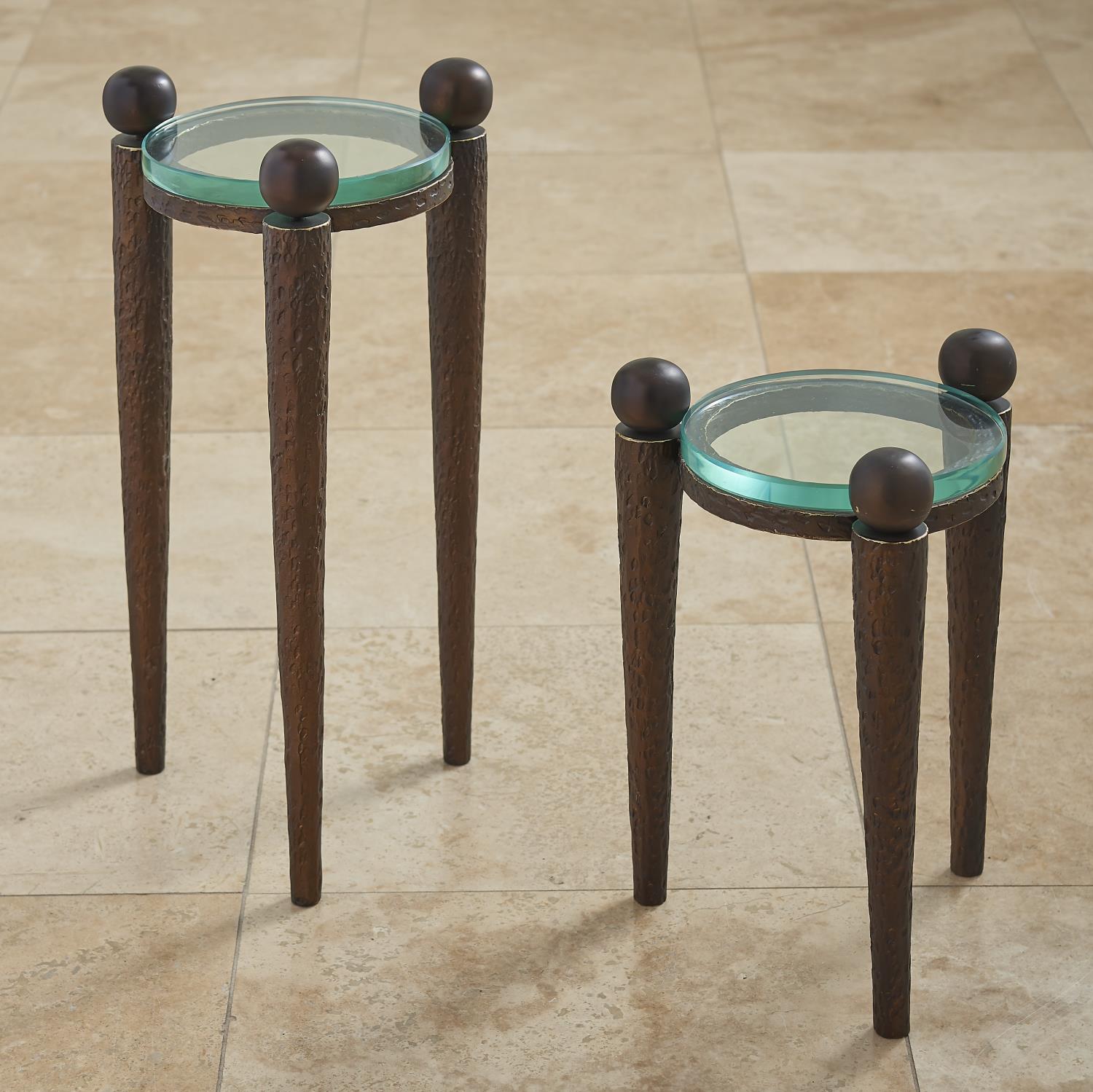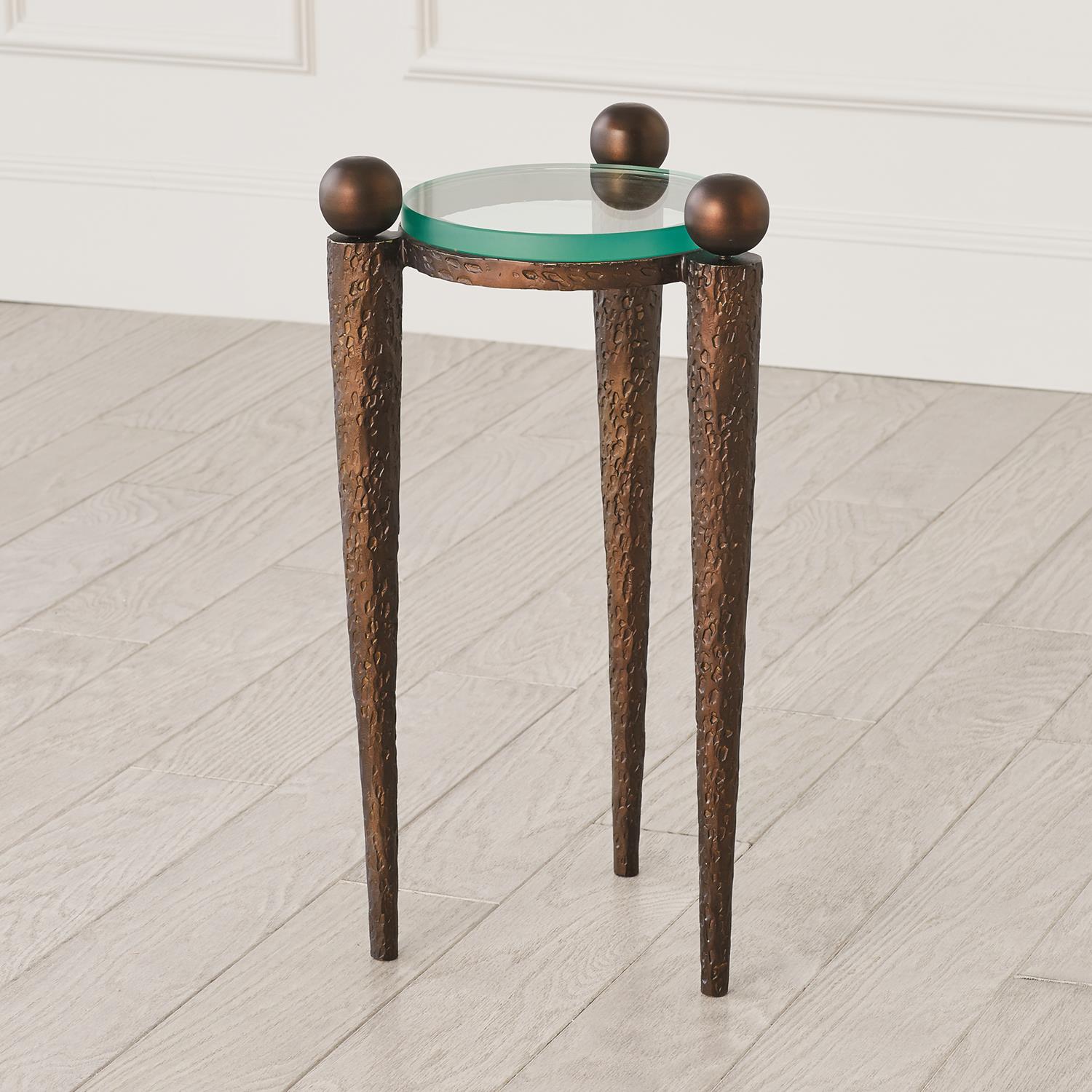 由細漸粗的金屬桌腳與厚實的玻璃桌面相得益彰,桌腳頂部的裝飾球兼具固定桌面的作用。輕鬆愉快的設計,如同空間中跳躍的精靈。 Made of iron with a metal bronze finish, this delightful accent table has three decorative spheres capturing the thick glass top. Available in two sizes.