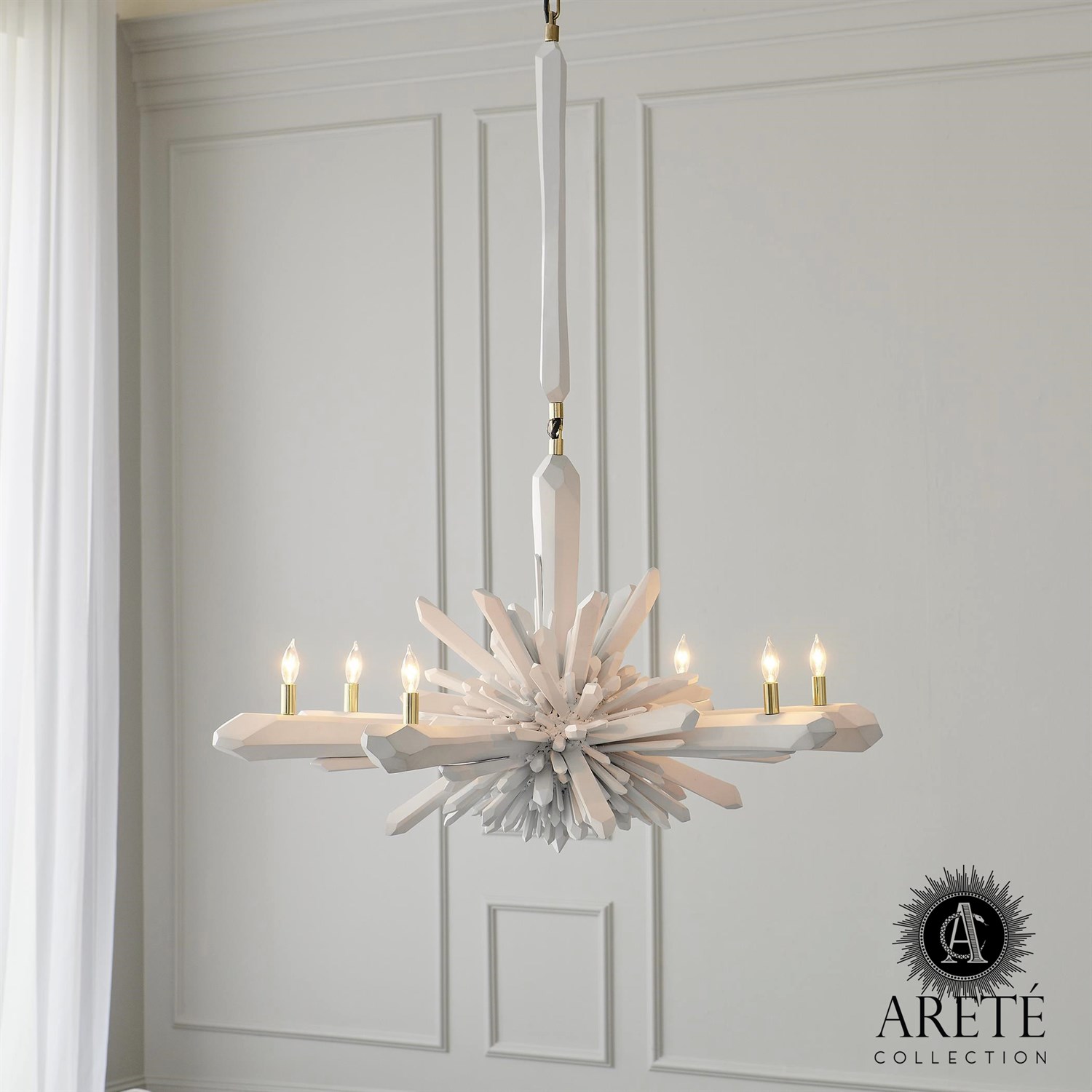 Inspired by natural crystal growth patterns and the work of Serge Roche, the facet chandelier is an explosion of style and elegance. Made of cast aluminum with a flat white finish. Holds six 40W candelabra bulbs.