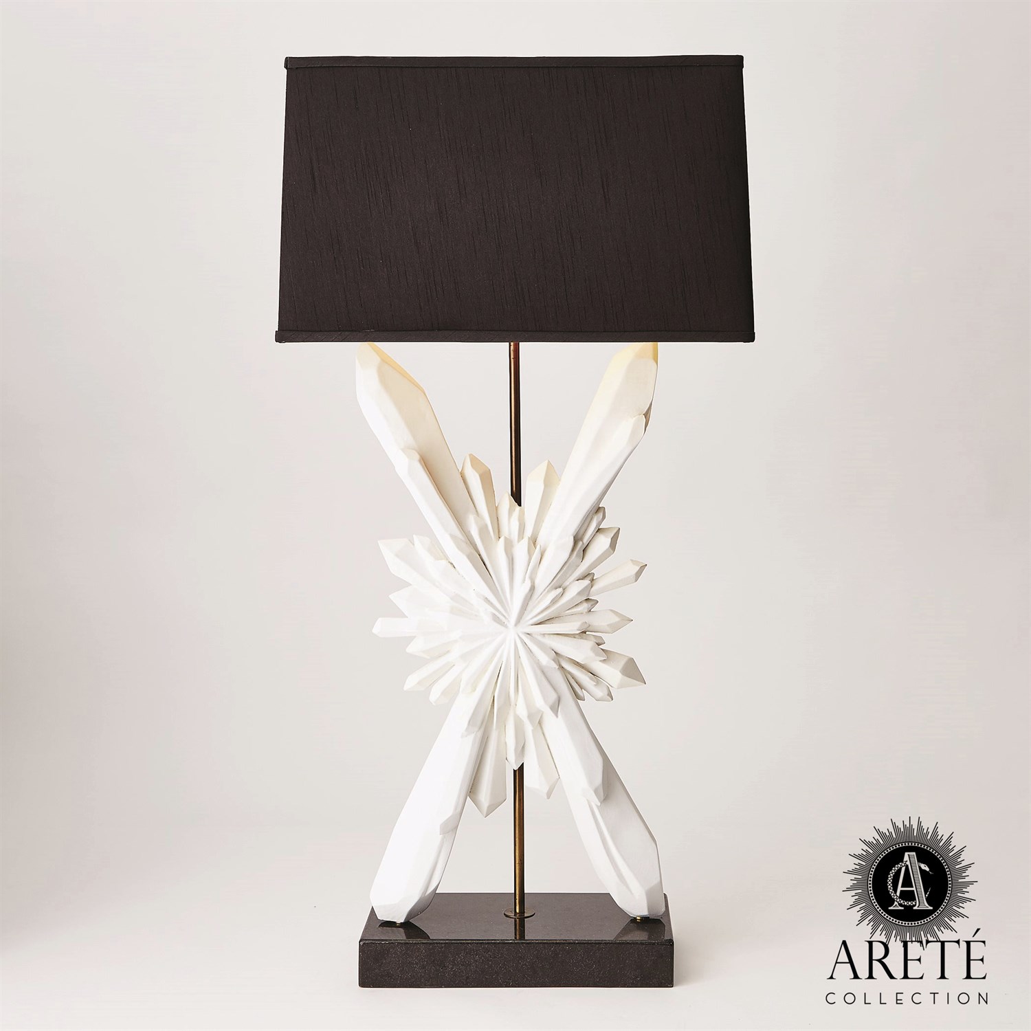 Hand cast resin with white finish on a black marble base. Brass hardware with 3-way socket. Comes with a black faux silk shade with gold lining.