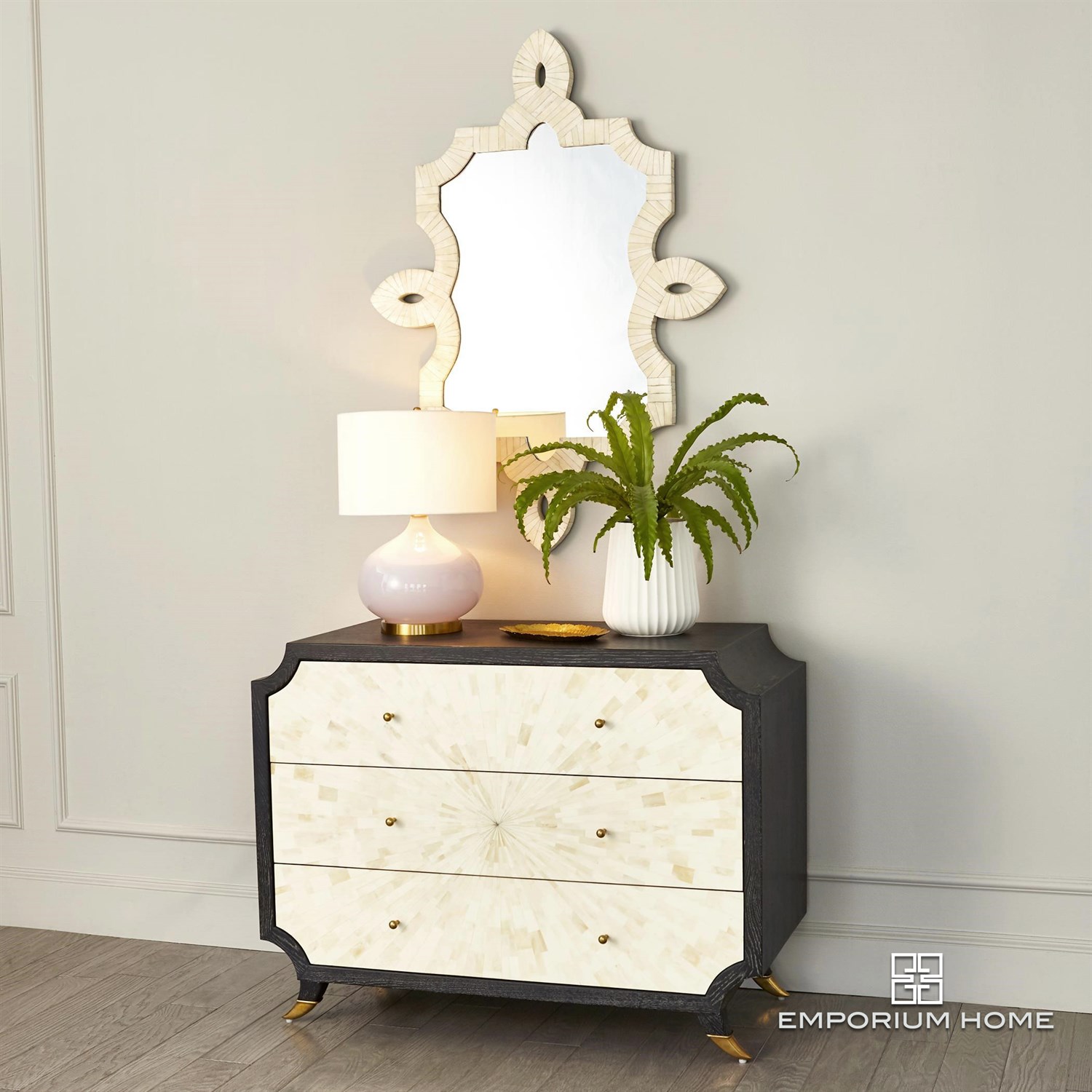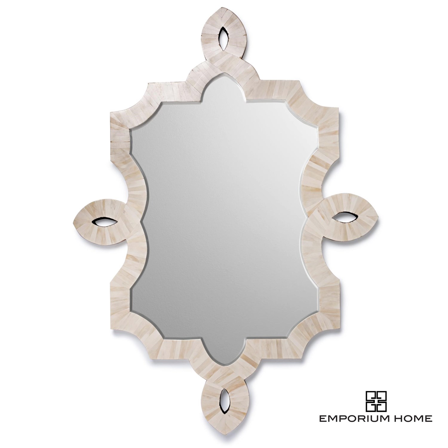 The unique shape and bone inlay of our Bethany Mirror has made it a customer favorite! Perfect for over a vanity or chest, this mirror will add unexpected style anywhere.