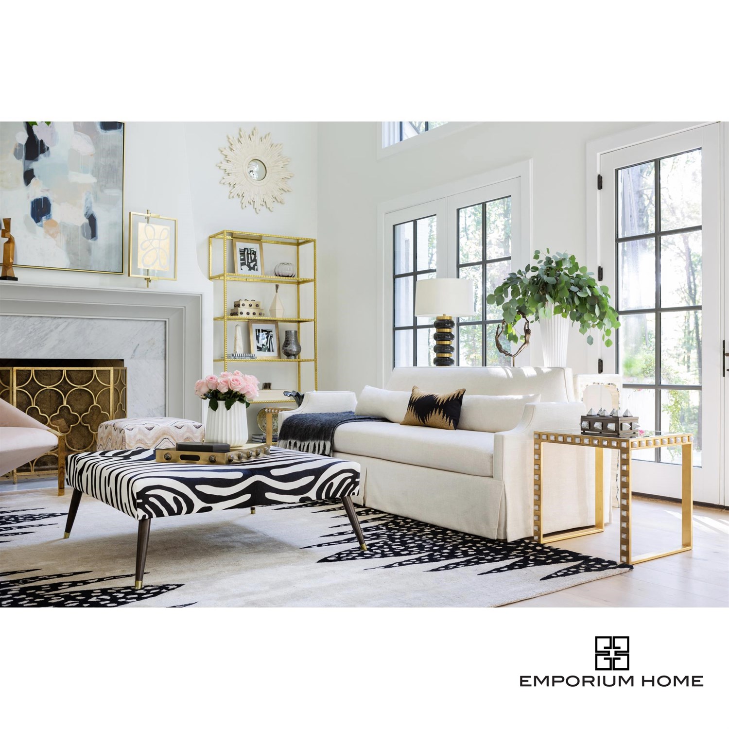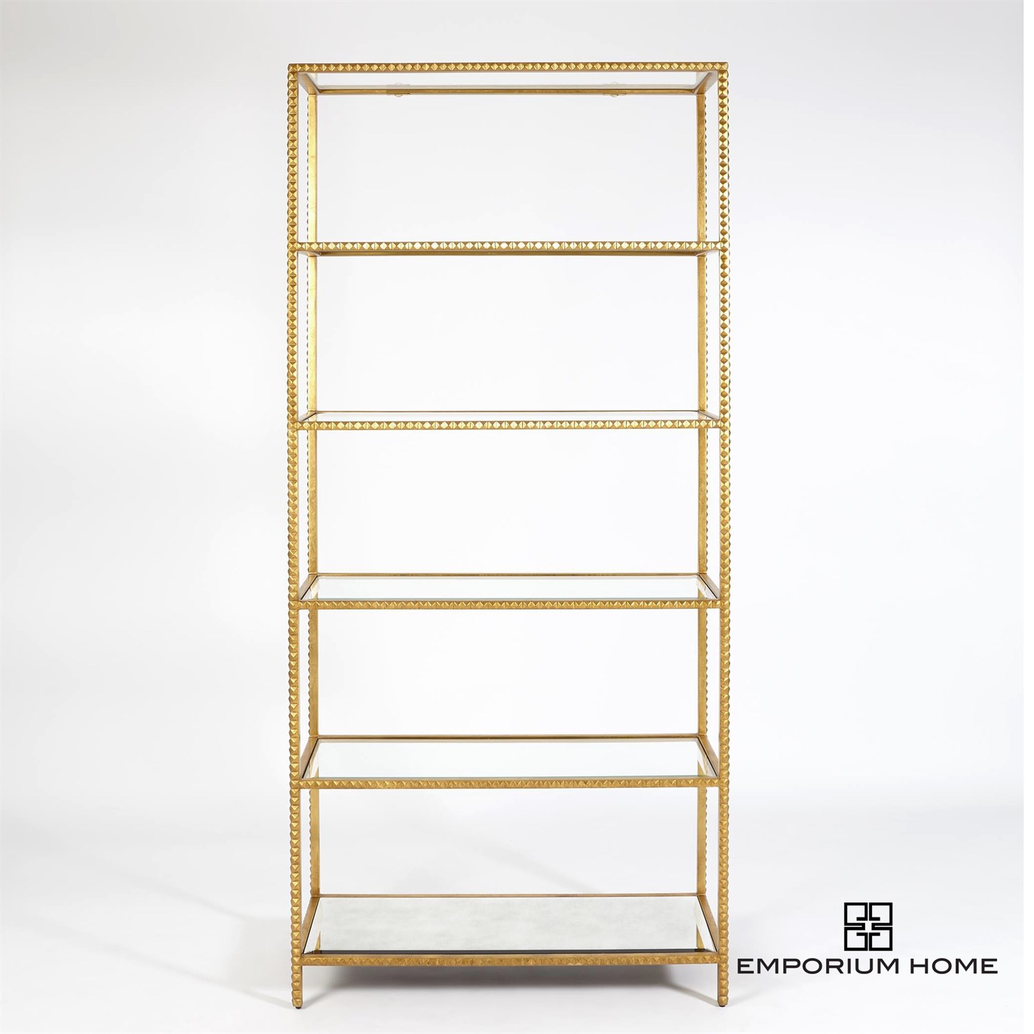 Our Stud Etagere brings the artistry of hand cast iron to a new level with a unique and on trend design element. Tiny pyramid studs line the entire frame of this design, all gleaming with a hand gilded gold leaf finish. Topped off with beveled glass shelves and an antique beveled mirror bottom shelf, this piece will add the perfect pop of rock and roll chic to any space.