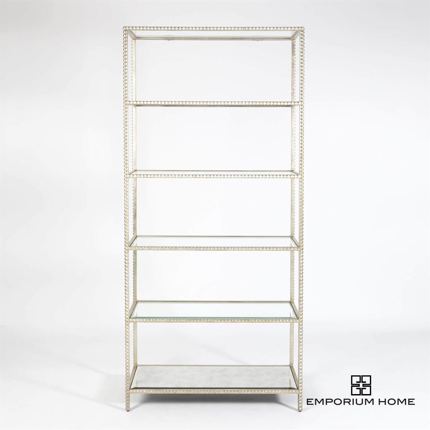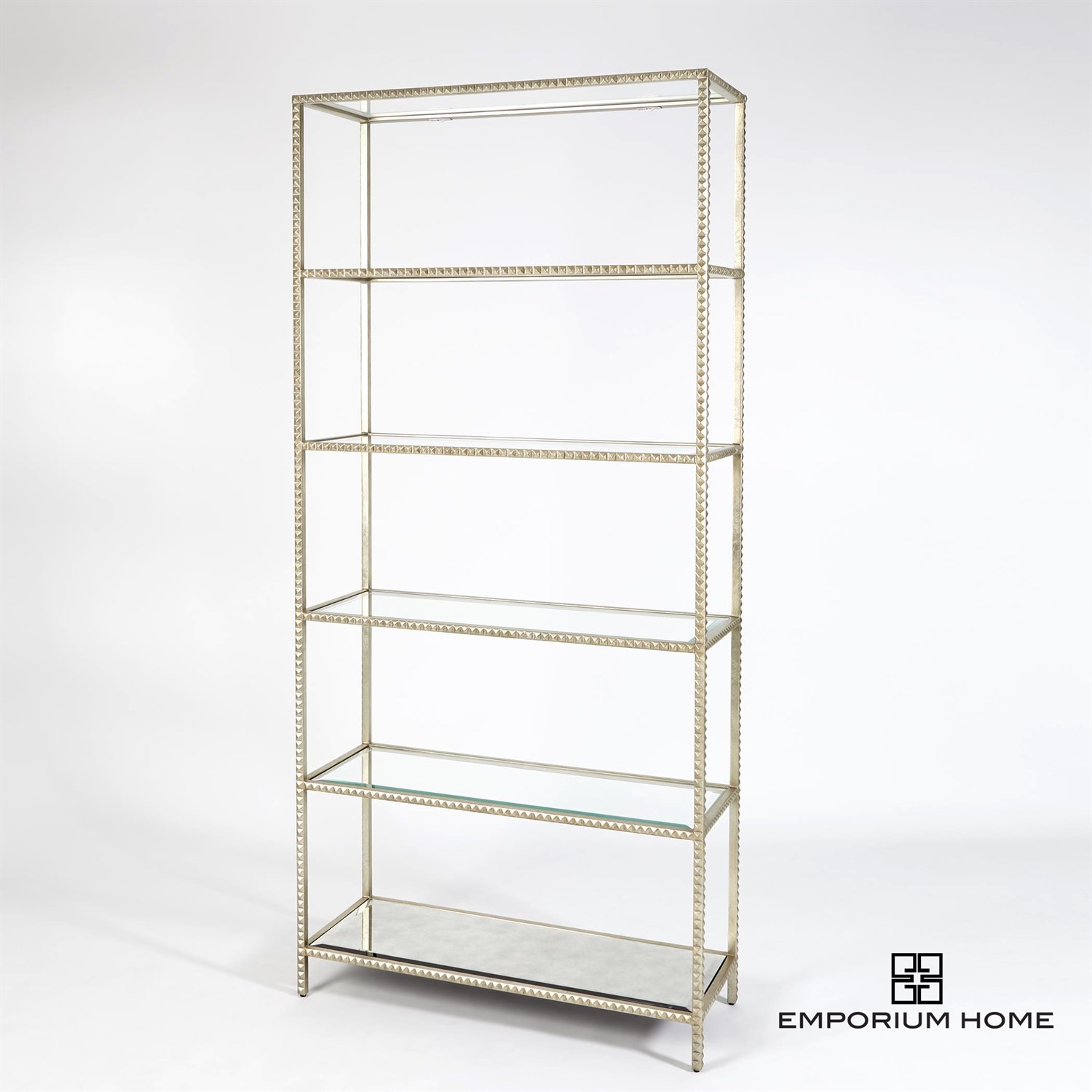 Our Stud Etagere brings the artistry of hand cast iron to a new level with a unique and on trend design element. Tiny pyramid studs line the entire frame of this design, all gleaming with a hand gilded silver leaf finish. Topped off with beveled glass shelves and an antique beveled mirror bottom shelf, this piece will add the perfect pop of rock and roll chic to any space.