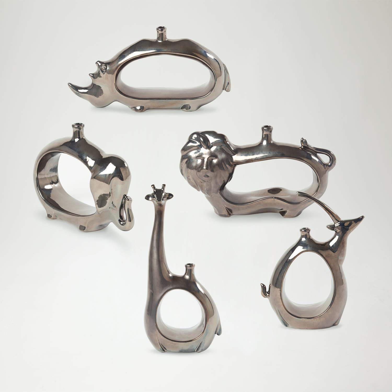 由義大利工匠手工製作,這些金屬花瓶的設計靈感來自於生活在非洲大草原的野生動物。 Made by Italian artisans, these metallic vases are inspired by wild animals living in the African Savanna.