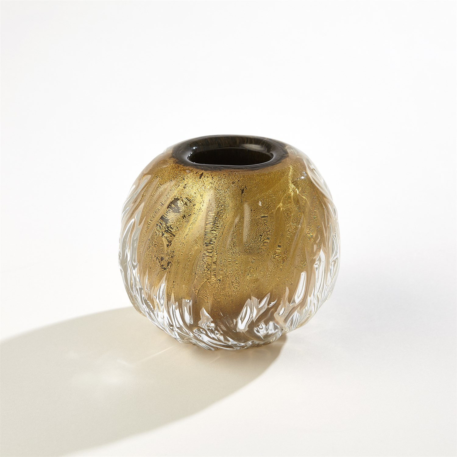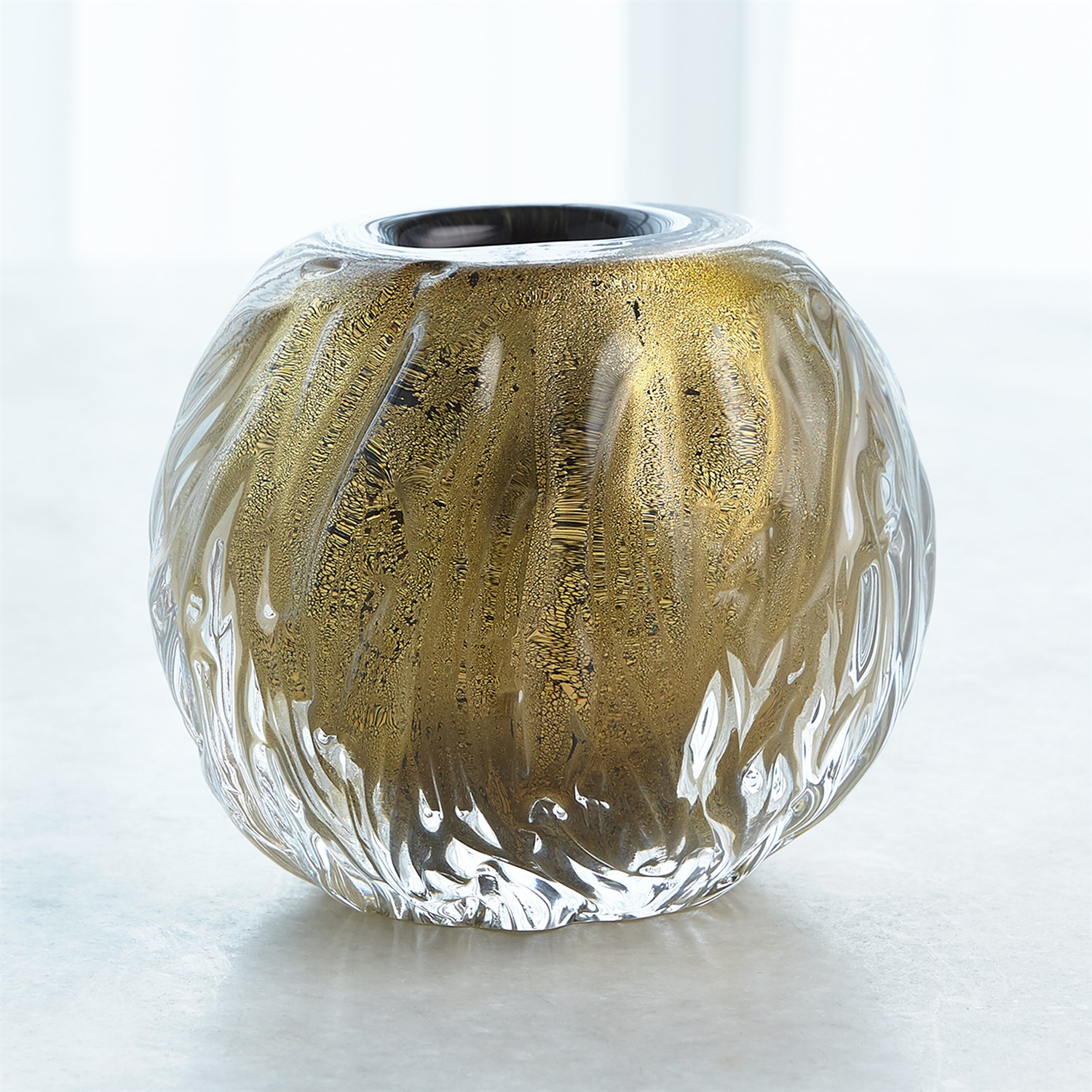 Italian art glass with encased color accomplished by blowing colored glass and gold leaf flecks into layers.