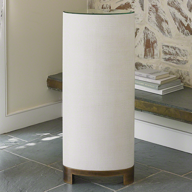 The oval shapes of the Ellipse Collection make them a stand-out in any interior. Each piece is first hand-wrapped on all sides in Belgian linen over an acacia veneer. A complex crackle finish is applied on top of the linen to give added dimensionality to the finish. Beveled mirror tops. Interiors are built entirely of American White Oak. Antique brass-finished base and hardware.
