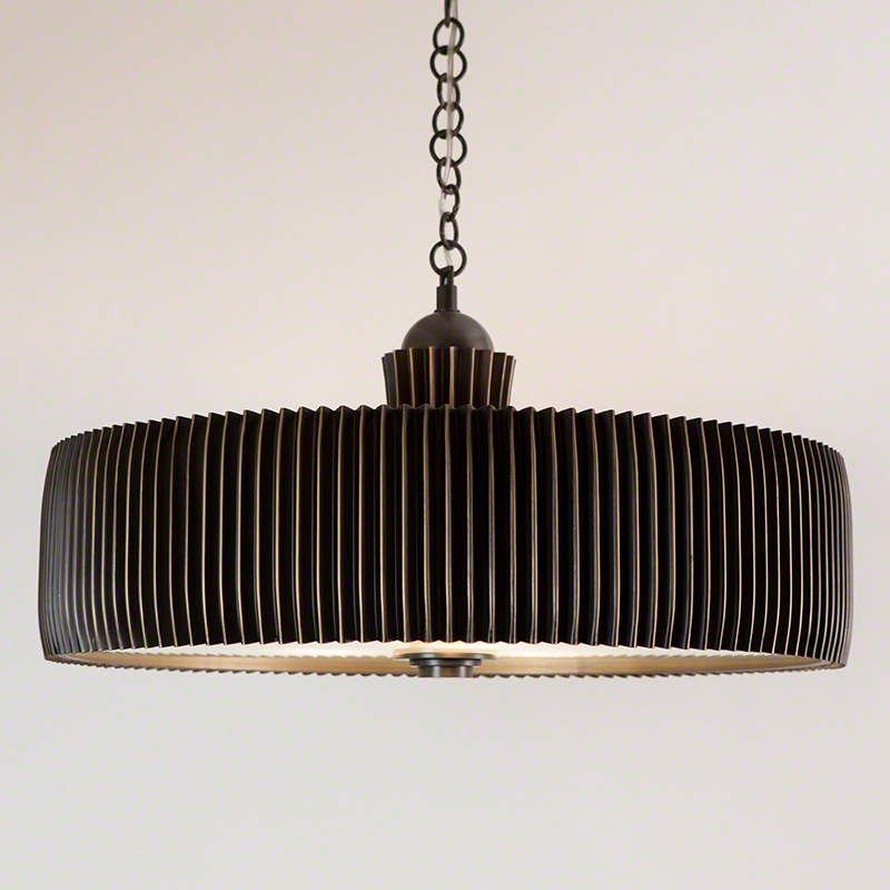 Hand-crimping the steel shade, then adding brass ribbing to the edges, gives the Crimp its unique three-dimensional character. Includes Frosted diffuser and bronze canopy.
