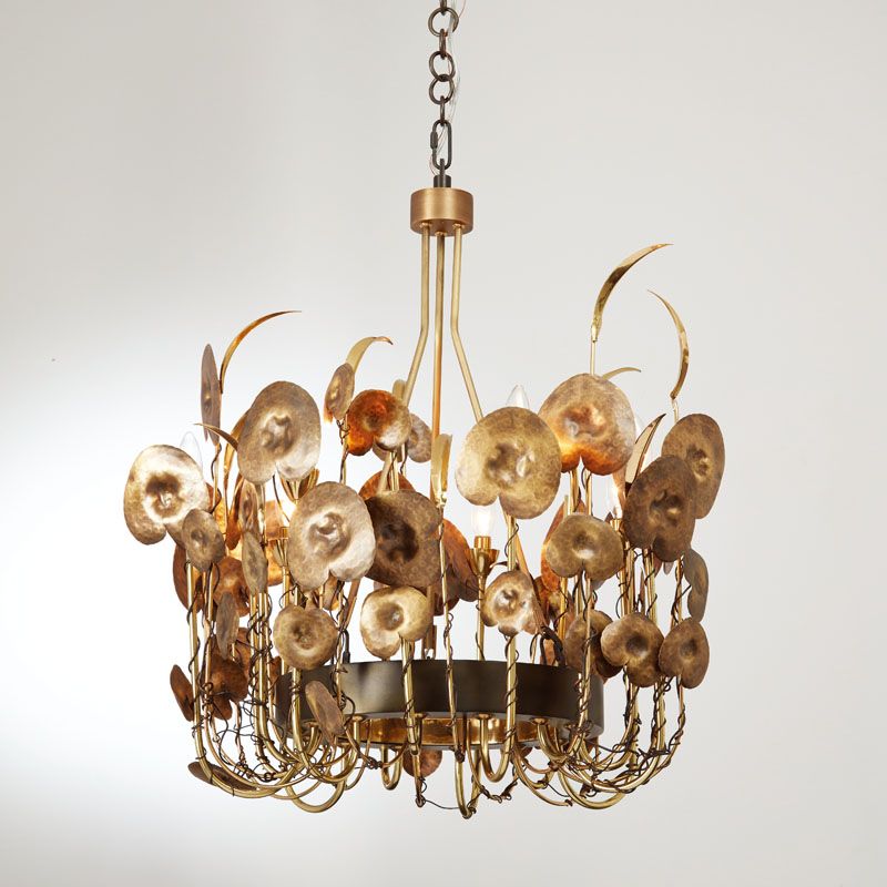 The Lilium Collection represents an abstract, unruly spray of lilies, leaves, petals and vines. Light reflects and refracts from the brass shapes creating a soft and magical glow from the fixture. Brass finish includes polished, antique and bronze. Available as a chandelier, portable and hardwired sconce. Also available in Nickel finish.