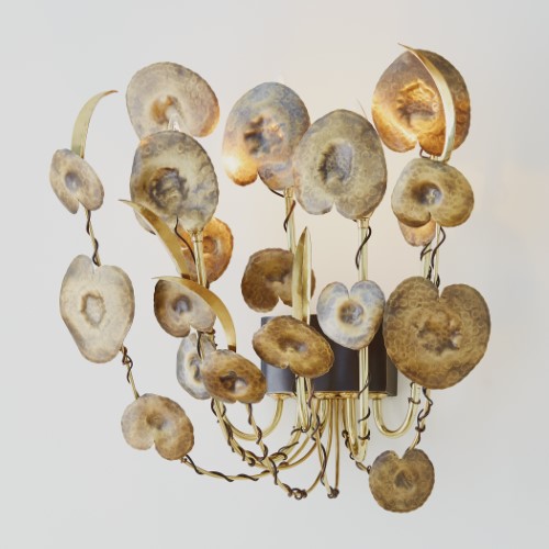 The Lilium Collection represents an abstract, unruly spray of lilies, leaves, petals and vines. Light reflects and refracts from the brass shapes creating a soft and magical glow from the fixture. Brass finish includes polished, antique and bronze. Available as a chandelier, portable and hardwired sconce. Also available in Nickel finish.