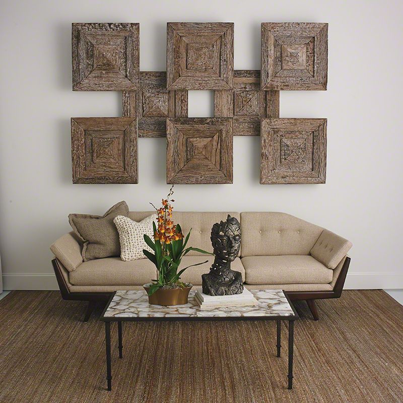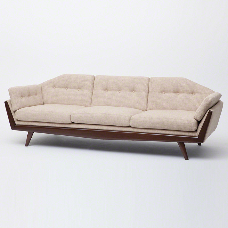 An ode to mid-century modern with a classic twist. The wood trim and legs on the Greta Sofa are carved in Honduras from sustainably farmed mahogany. Down-wrapped, Dacron bottom cushions, hand-tied springs.