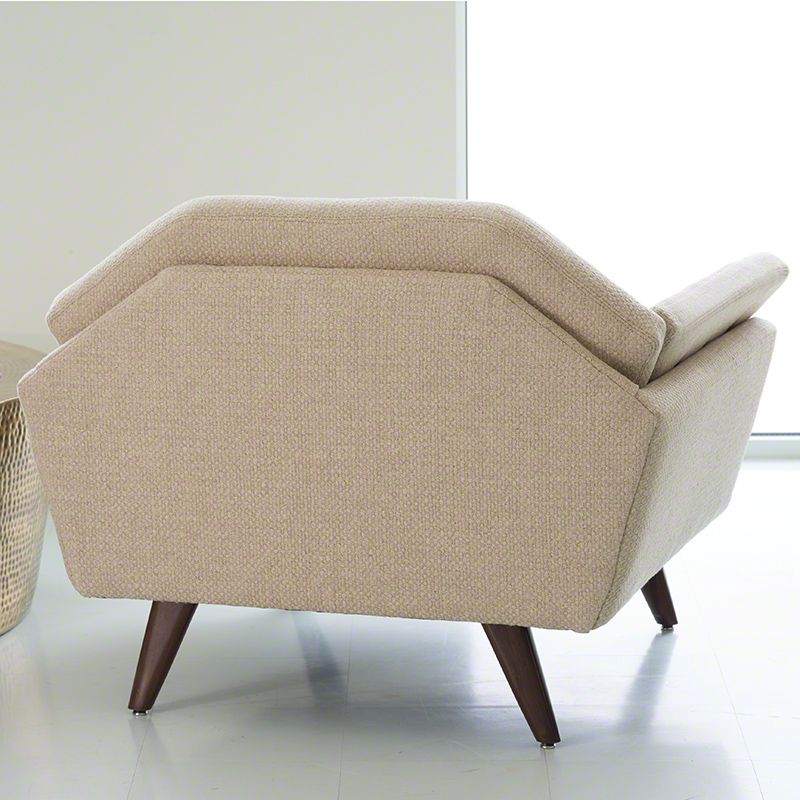 An ode to mid-century modern with a classic twist. The wood trim and legs on the Greta Lounge Chair are carved in Honduras from American Walnut. Down-wrapped, Dacron bottom cushions, hand-tied springs. Available in three fabric choices or COM. Protege Grid Natural, Alvaro Grey, Margo Pewter.