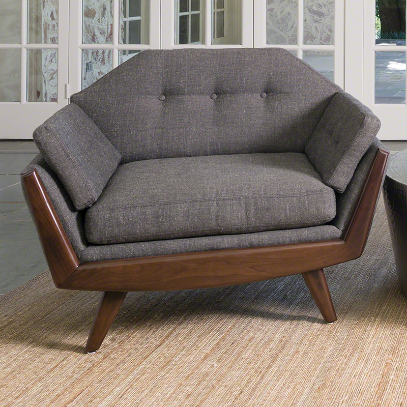 An ode to mid-century modern with a classic twist. The wood trim and legs on the Greta Lounge Chair are carved in Honduras from American Walnut. Down-wrapped, Dacron bottom cushions, hand-tied springs. Available in three fabric choices or COM. Protege Grid Natural, Alvaro Grey, Margo Pewter.