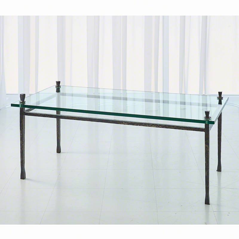 天然的鐵質架構,保留了原始與粗獷,同時堅固無比,一塊厚達5/8英寸的透明玻璃猶如懸浮在桌架上空。 A 5/8-inch thick glass top seems to float in the frame of the Quad Pod Cocktail Table. The solid iron table has a Natural Iron finish. Also available in Gold Leaf finish.