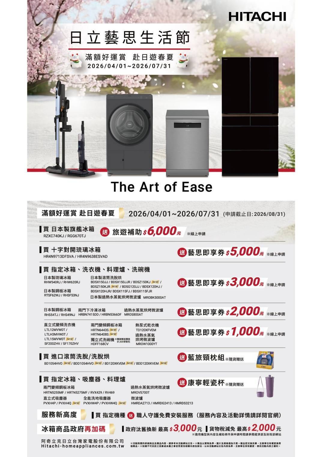 活動期間2026/04/01~2026/07/31止(以購買發買發募發期為憑)購員阿奇立克日立台灣家電股份有限公司指定機型完成官網線上申請並審核通過,即可免費獲得「可樂旅遊補助」或「藝思即享券」。